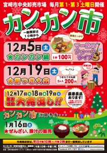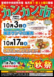 11月のカンカン市 2015年11月6日 最終更新日時 : 2025年9月29日 miyazakiichiba 朝晩が急に冷え込むようになり、日に日に秋が深まる季節となりました! 今月のカンカン市、7日は食欲の秋にぴったり! 甘くてホクホクの美味し~い焼き芋を100円で販売! 更に、みかん好きの方集合!! 早食い競争やっちゃいます♪ なんと!上位5名の方にみかん1箱をプレゼント!! そして、みなさんお待ちかね!11月21日開催の秋祭りへ向けてどんどん盛り上がっていきますので、ご家族、お友達を誘ってご一緒に市場関連店舗へお越しください。お待ちしております(^^♪