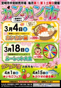 2月のカンカン市 2017年1月31日 最終更新日時 : 2025年9月29日 miyazakiichiba まだまだ寒い日が続いていますので、体調には気を付けたいですよね! 2月のカンカン市では、温かくて美味しい食べ物をご用意してお待ちしていますよ♪ 4日は、おあげの美味しいきつねうどん・きつねそばを1杯200円で販売します。 18日はお待ちかねのワンコインSALEを開催♪いいものたくさん(^^♪買いすぎ注意です!! 心も身体もあったまる、おもてなしいっぱいのカンカン市へ、どうぞお越しください♪