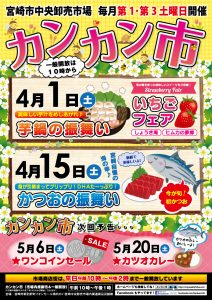 5月のカンカン市 2017年5月16日 最終更新日時 : 2025年9月29日 miyazakiichiba 桜の季節も終わり、太陽の日差しと新緑がまぶしい季節がやってきましたね!! そんなまぶしさにも負けず、カンカン市もどんどん盛り上がって行きますよ~~(*^^)v 6日は、毎回好評いただいております、ワンコインセール♪ お得に買えるこの時をお見逃しなく!! 20日は、じっくり煮込んだ牛筋カレーが登場!なんと!! 1杯200円♪ 更に、農林中央金庫宮崎推進室から、花の種プレゼント♪ ご家族、お友達を誘ってカンカン市に遊びに来てください!スタッフ一同お待ちしています(^^♪