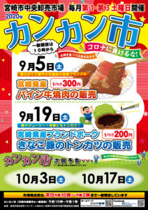 【中止】令和2年8月のカンカン市中止のお知らせ 2020年7月30日 最終更新日時 : 2025年9月29日 miyazakiichiba いつもご愛顧いただき、誠にありがとうございます。 新型コロナウイルスの感染拡大の予防の為、開催を検討しておりました、8月6・7・8日(木・金・土)の夏の大売出しに関しましても、開催を中止することが決定いたしました。 開催を楽しみにして下さった皆様には、急なご案内となりご迷惑をおかけしますが、ご理解をいただきますようお願い申し上げます。 ※今後の状況をふまえ、9月のカンカン市に関しましても対応を随時お知らせしていきます。