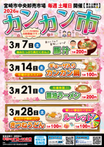 こんにちは!寒さに弱~い宮崎人には辛い寒さが続いています…が、子供も大人も寒さに負けず2月のカンカン市にいらしてくださいね!(^^)! 早速ですが、令和8年2月のカンカン市のご紹介です☆ ■2月7日(土) ・宮崎農業高校 […]