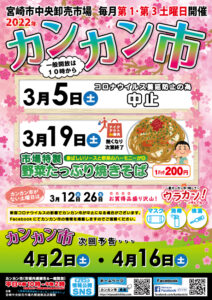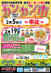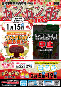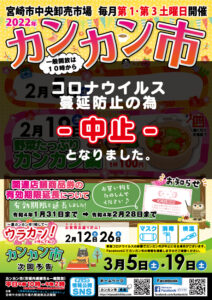いつもご愛顧いただき、誠にありがとうございます。 新型コロナウイルスの感染拡大の予防の為、開催予定でした令和4年2月5日㈯と、2月19日㈯のカンカン市の開催を中止することが決定いたしました。 開催を楽しみにして下さった皆 […]